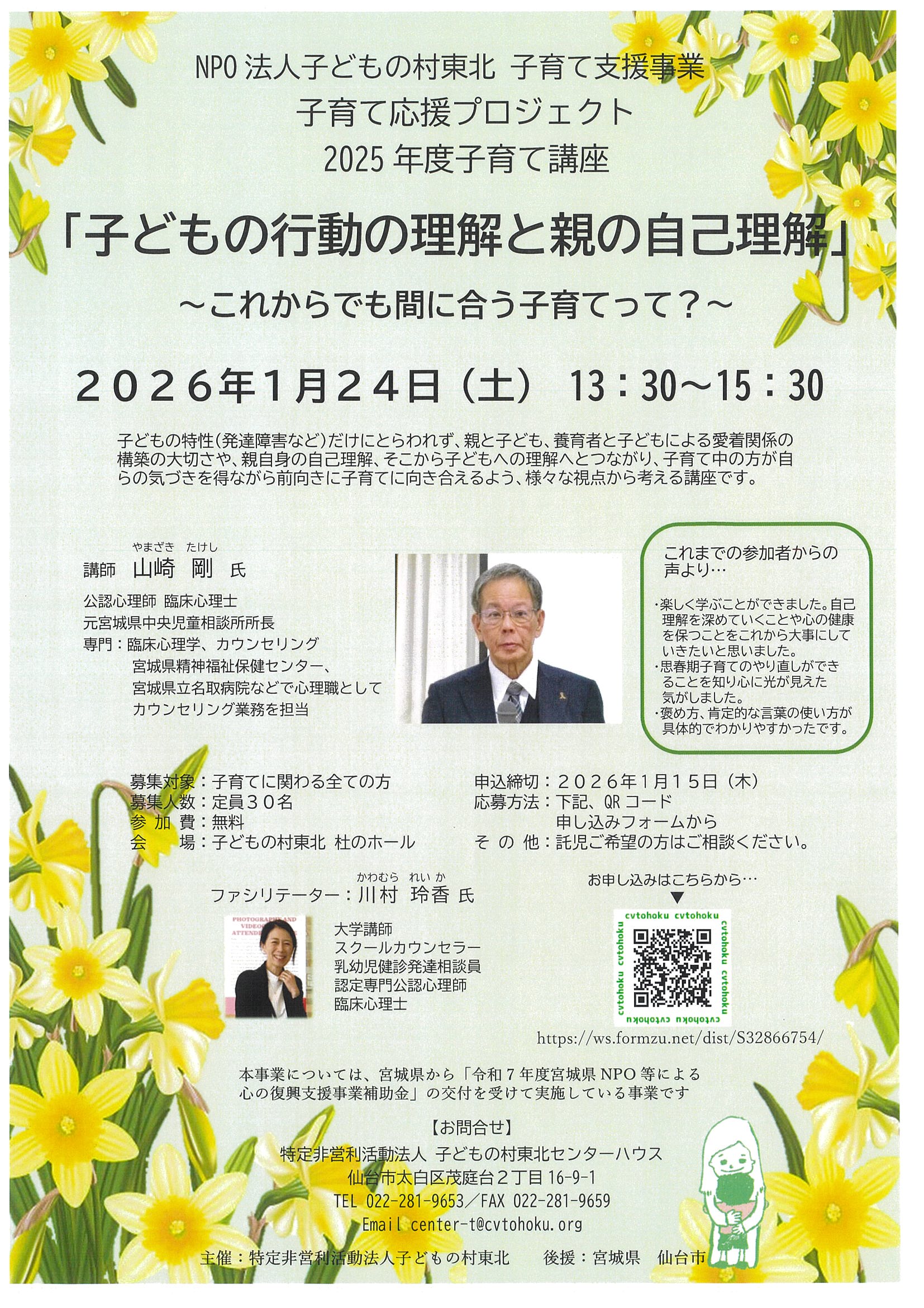 2026年1月24日(土曜日)に子どもの村東北に於きまして子育て応援プロジェクト子育て講座2025を開催いたします。