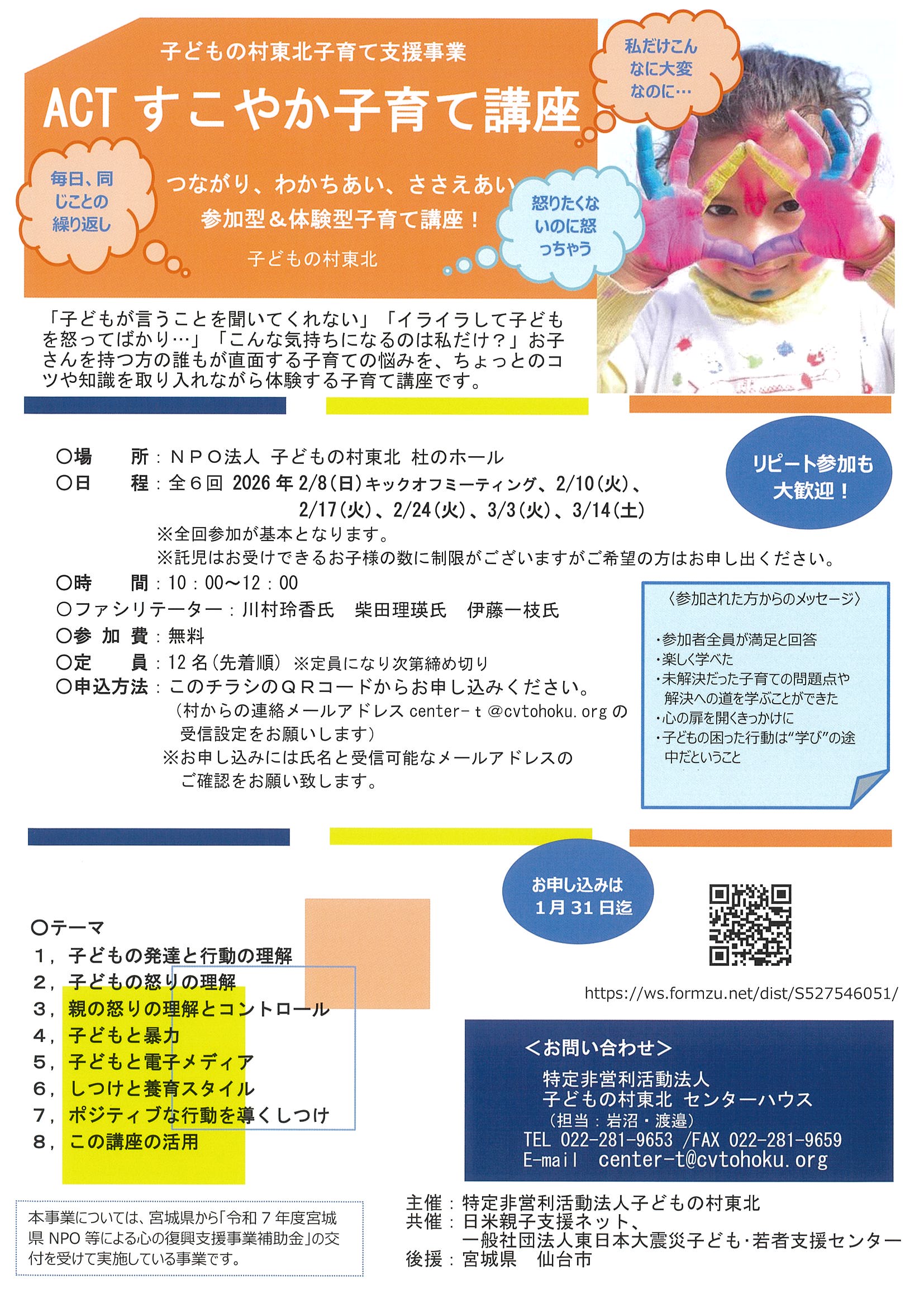 2026年2月8日(日曜日)から子育て中の方に向けた「ACTすこやか子育て講座」(全6回)を開催いたします。