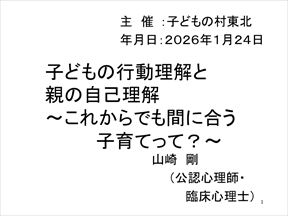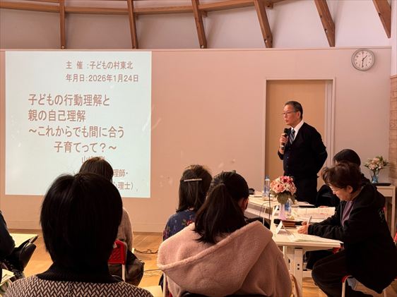 2026年1月24日(土曜日)13時30分より、子どもの村東北~子育て支援事業~子育て応援プロジェクト子育て講座2025を、講師に公認心理師・臨床心理士の山崎剛氏をお迎えし「子どもの行動の理解と自己理解」と題しまして開催いたしました。参加の皆さまから事前にいただきましたご質問にもお答えいただき、大変わかりやすいお話を伺えました。